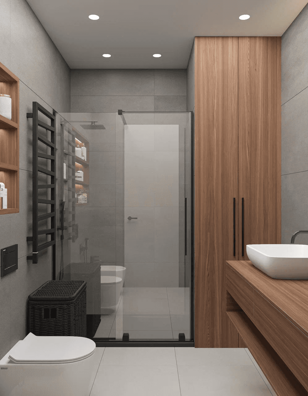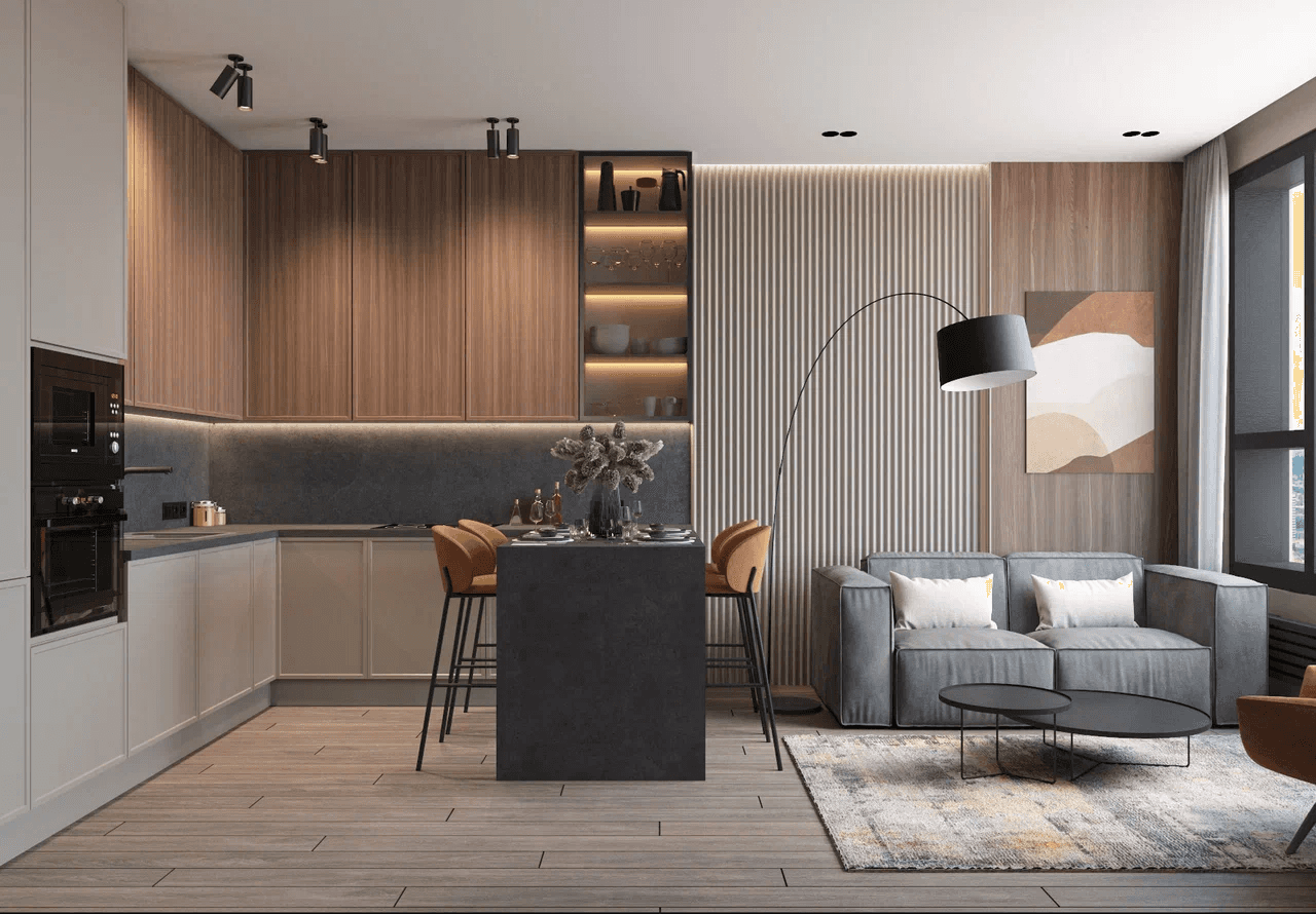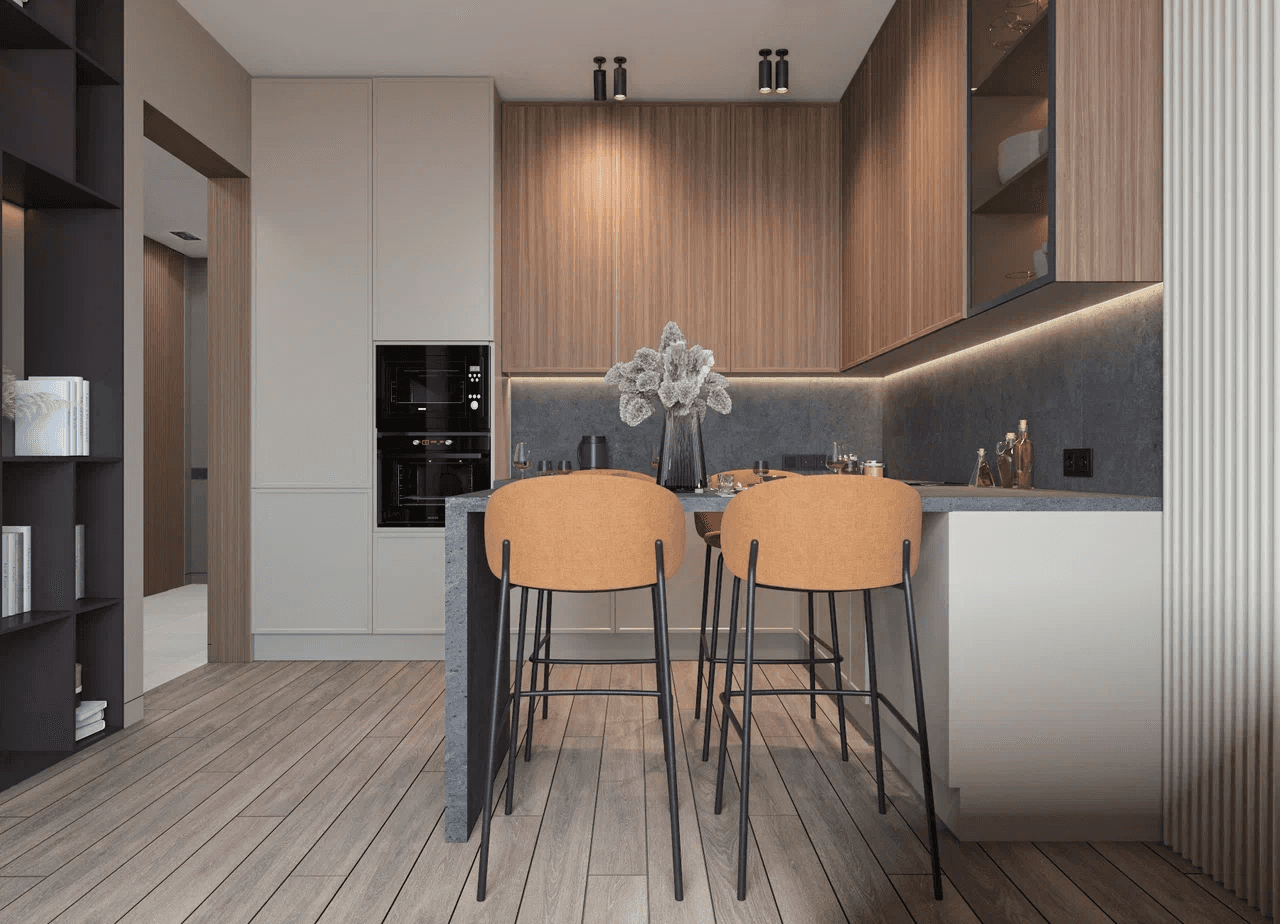 Мы всегда прикладываем максимум усилий для того, чтобы даже в небольших квартирах разместить все необходимое для комфортной жизни. В квартире площадью 42 кв.м удалось разместить кухню-гостиную с зоной просмотра ТВ и зоной для чтения, спальню с рабочим местом и гардеробной, отдельную гардеробную при входе, санузел с душевой и постирочной.