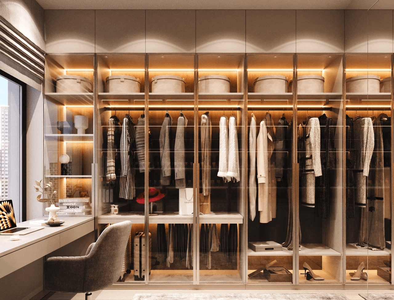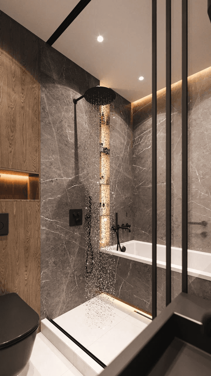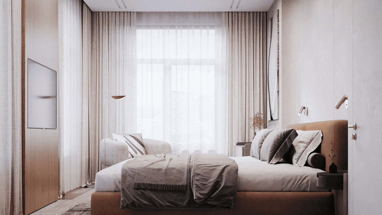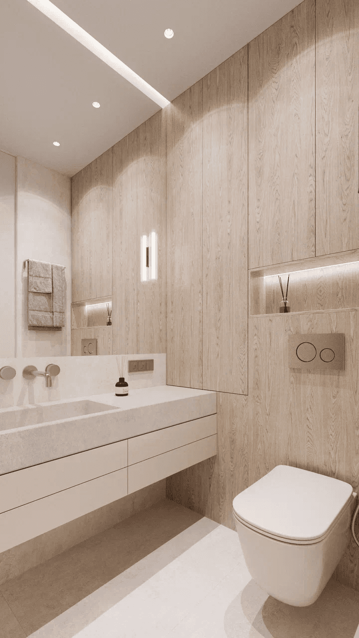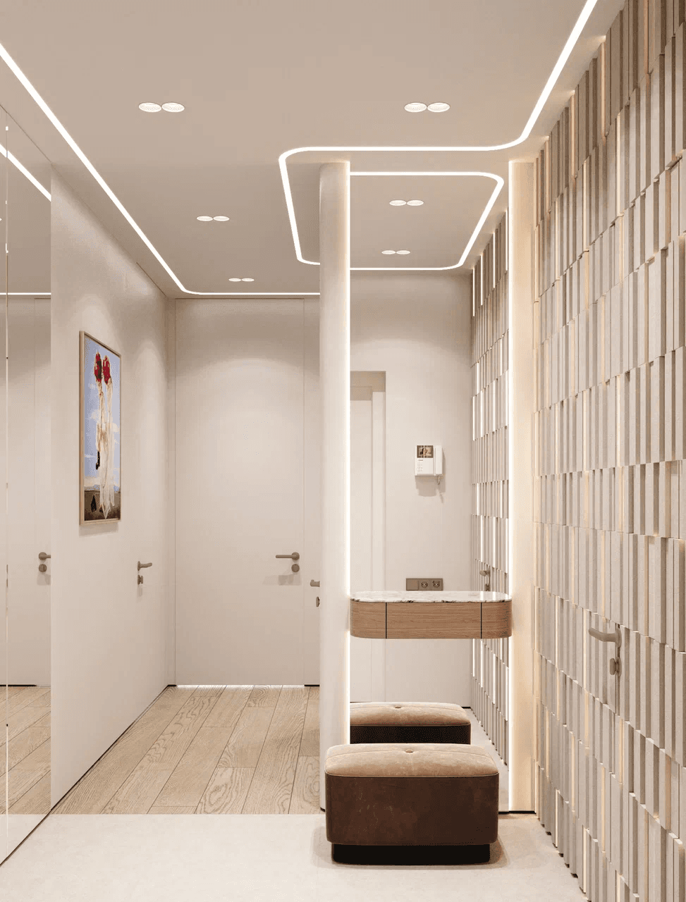 По цветовой гамме пожеланием заказчиков был современный лаконичный интерьер в светлых теплых тонах с ощущением света и воздуха, использованием шпона в отделке, а в мастер-зоне – темных серых оттенков.