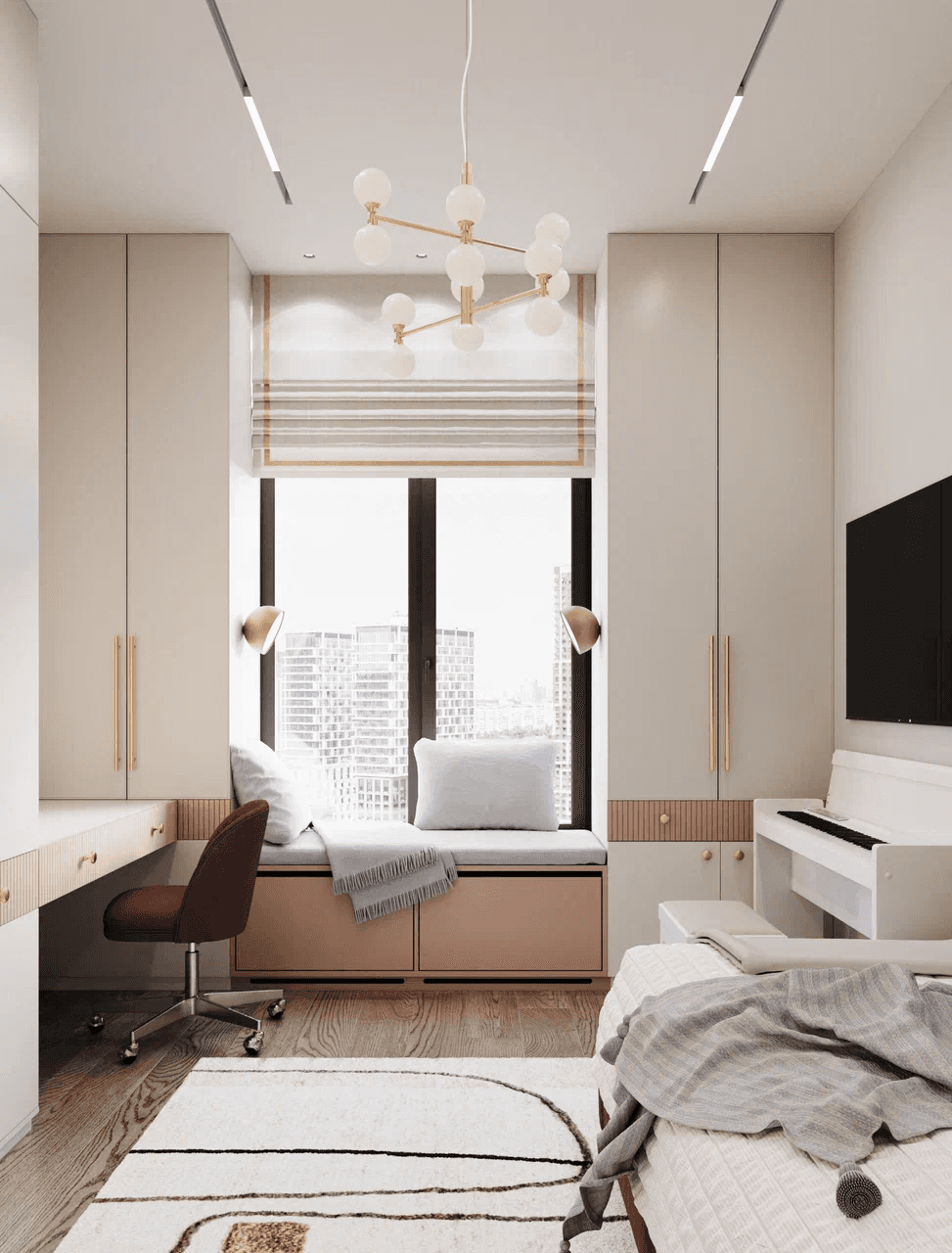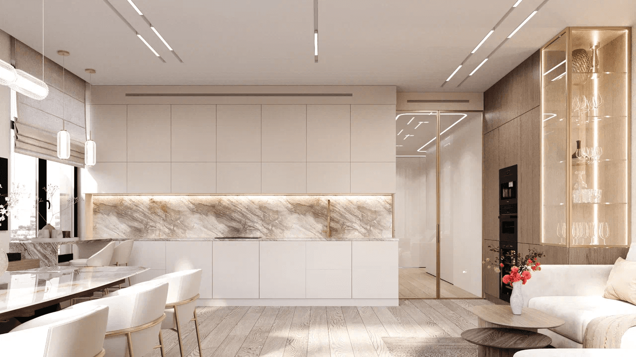 В результате разработана удобная планировка с отдельной мастер-зоной со спальней, гардеробной и двумя санузлами, один из которых оборудован хаммамом, а второй – бочкой для обливания. Кроме того, предусмотрена зона с тремя удобными детскими комнатами и ванной, гостевым санузлом и отдельной комнатой для занятий спортом. Сердцем пространства стала просторная кухня-гостиная для совместного времяпрепровождения семьи. Там же разместили барную стойку, чтобы можно было любоваться видом на набережную и проходящими речными трамвайчиками . Удалось предусмотреть много мест хранения, изолированную постирочную, спальное место для гостей, кабинет для главы семьи и рабочую зону для хозяйки дома.